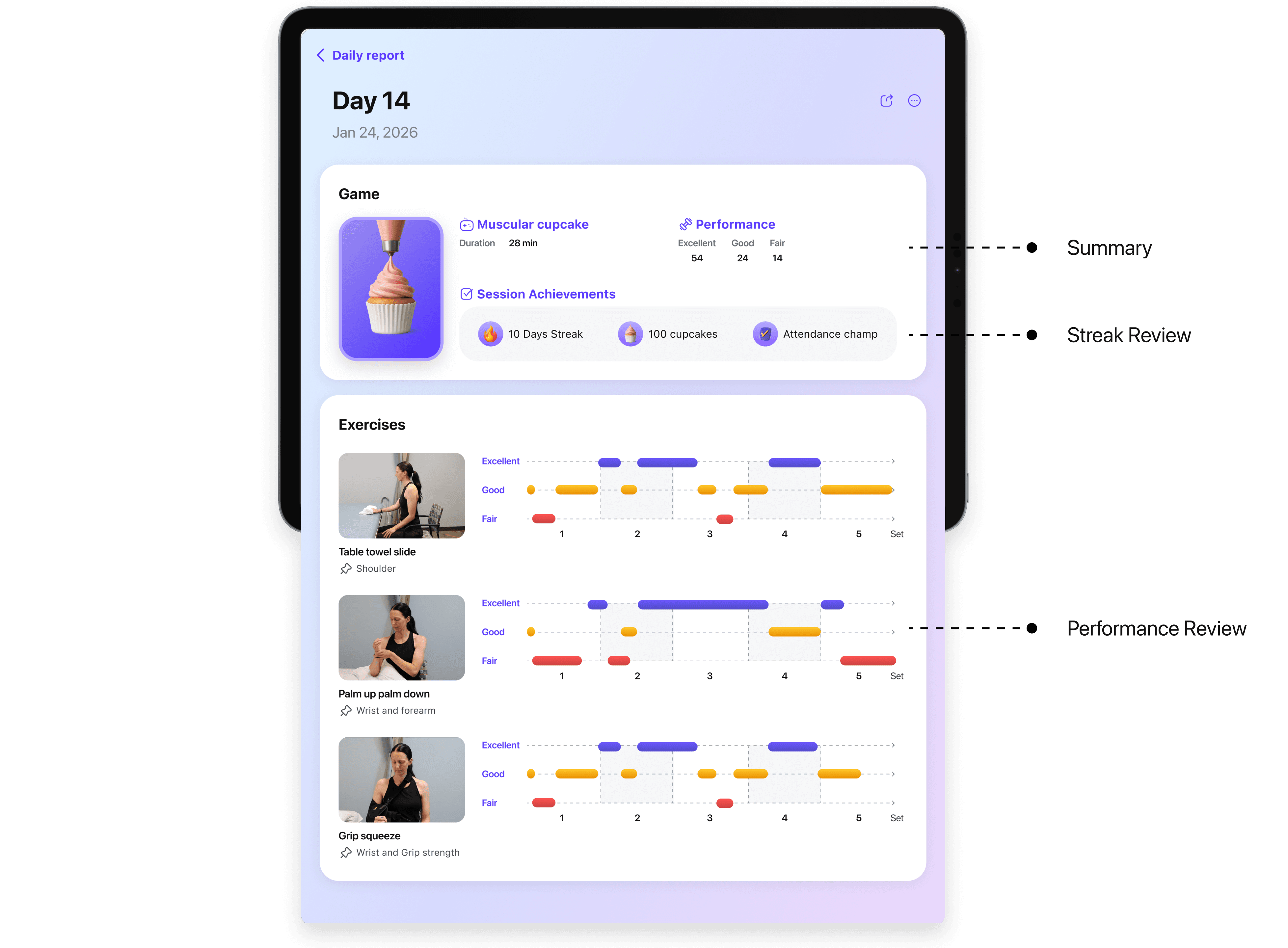 The exercise report makes progress visible, helping users reflect on consistency and improvement across each day.