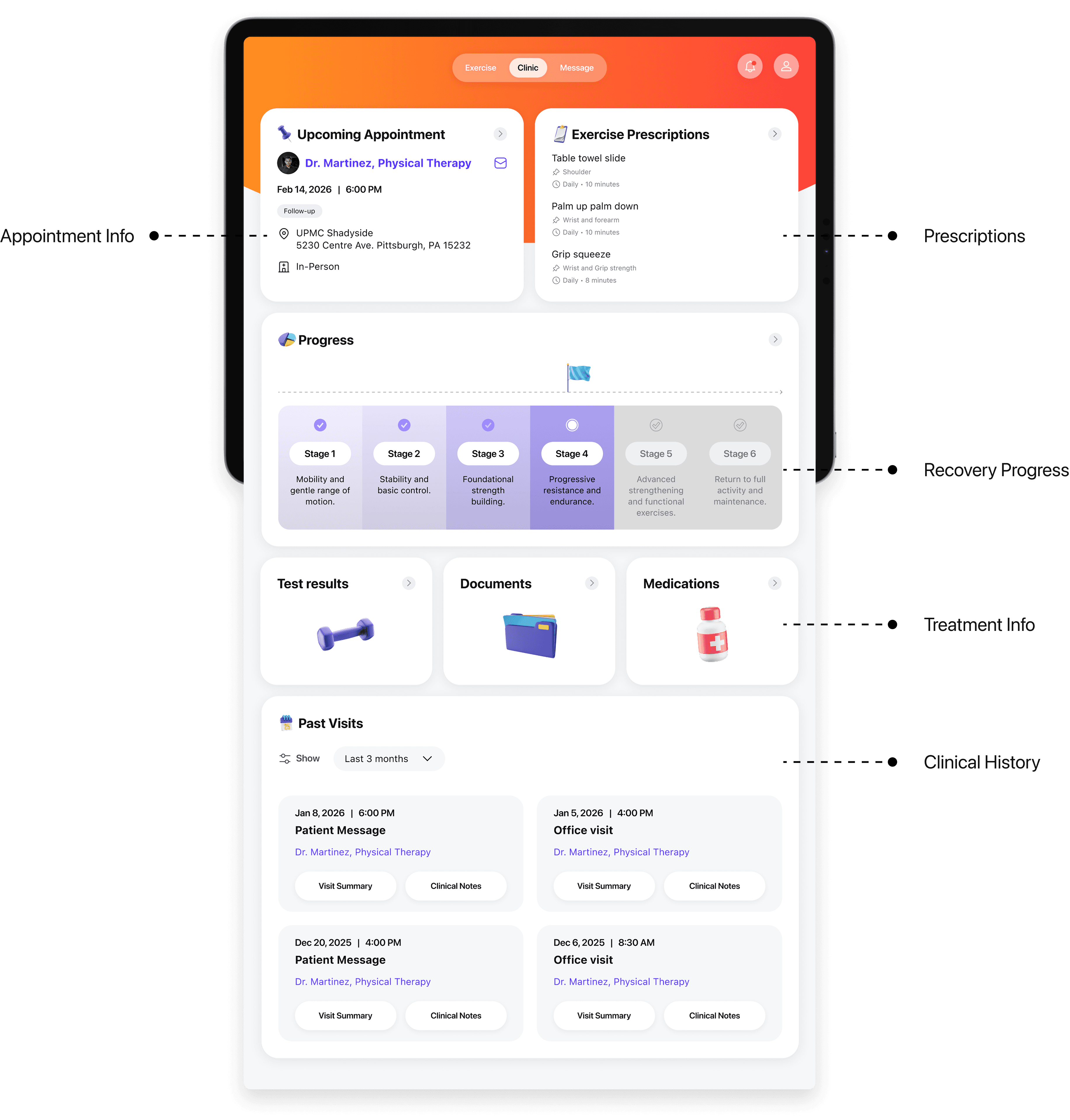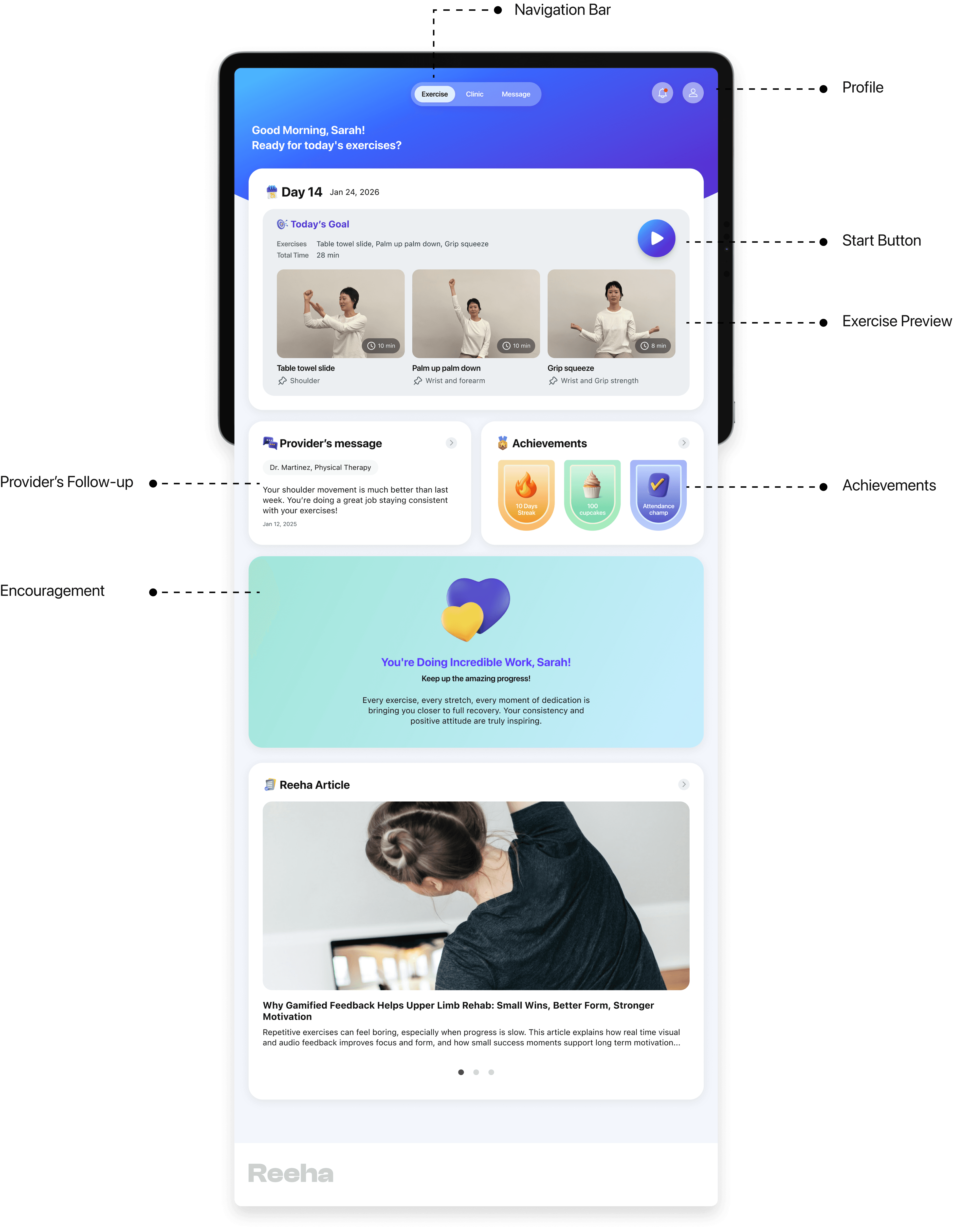 The home page focuses on momentum. It reduces friction at the start of each day and keeps users oriented, motivated, and engaged throughout their rehabilitation journey.
