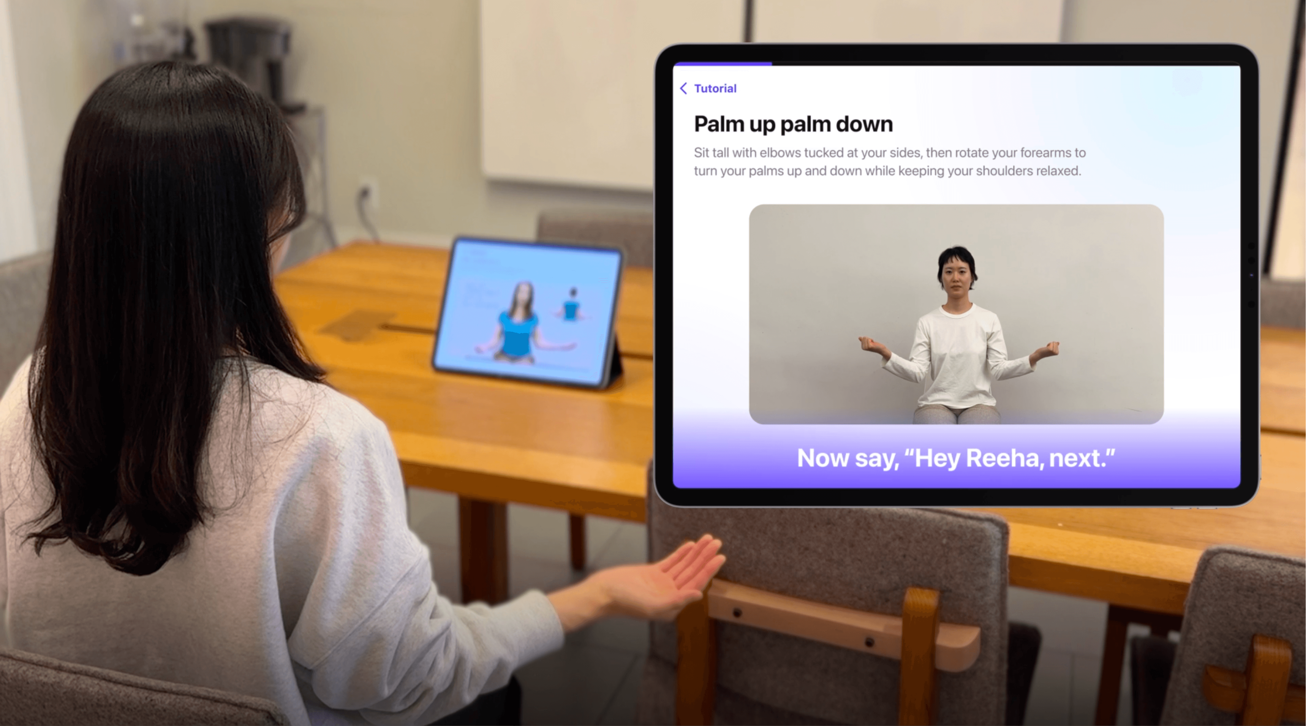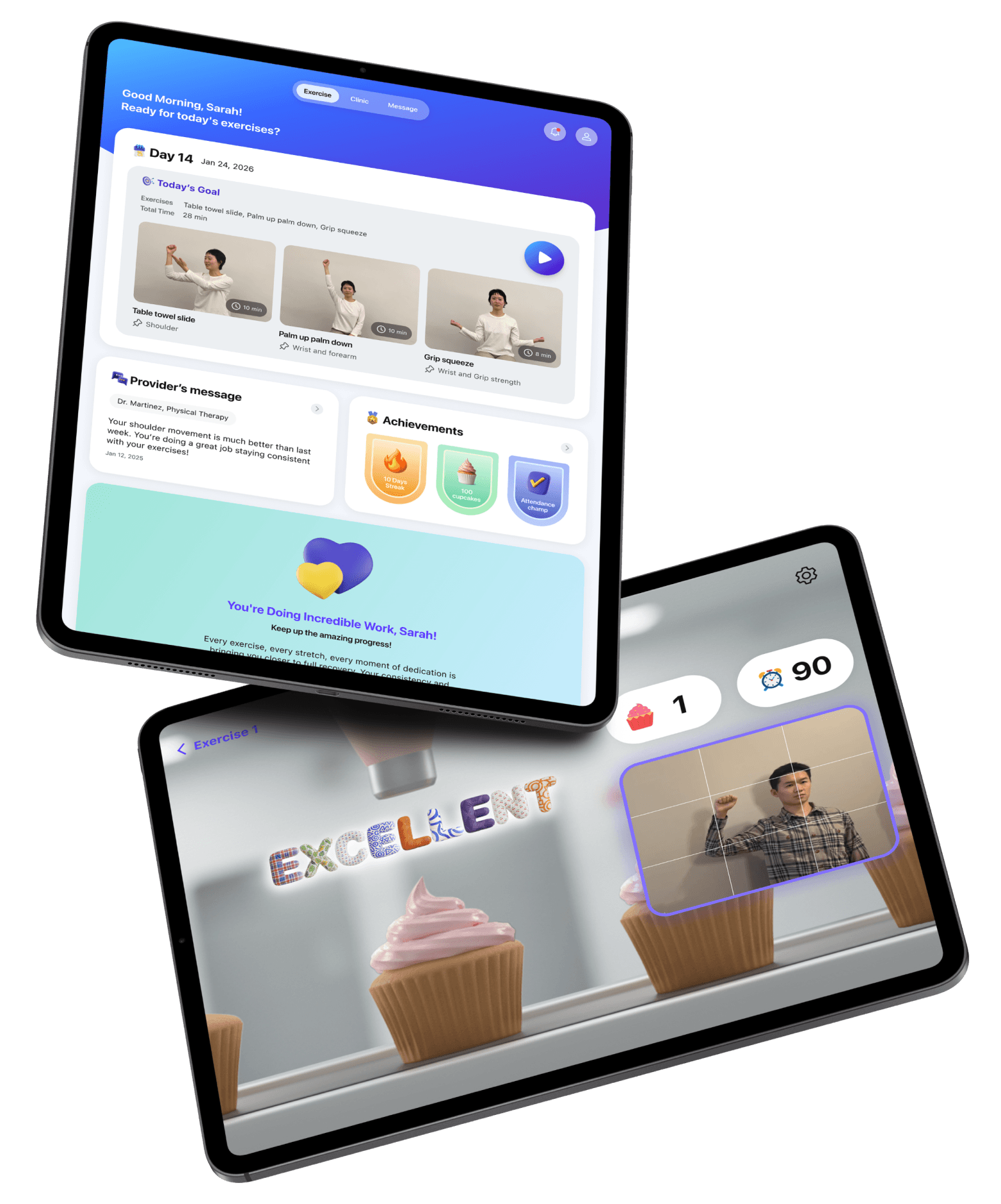 The patient follows exercise guides on the screen while the TrueDepth camera tracks their movements.