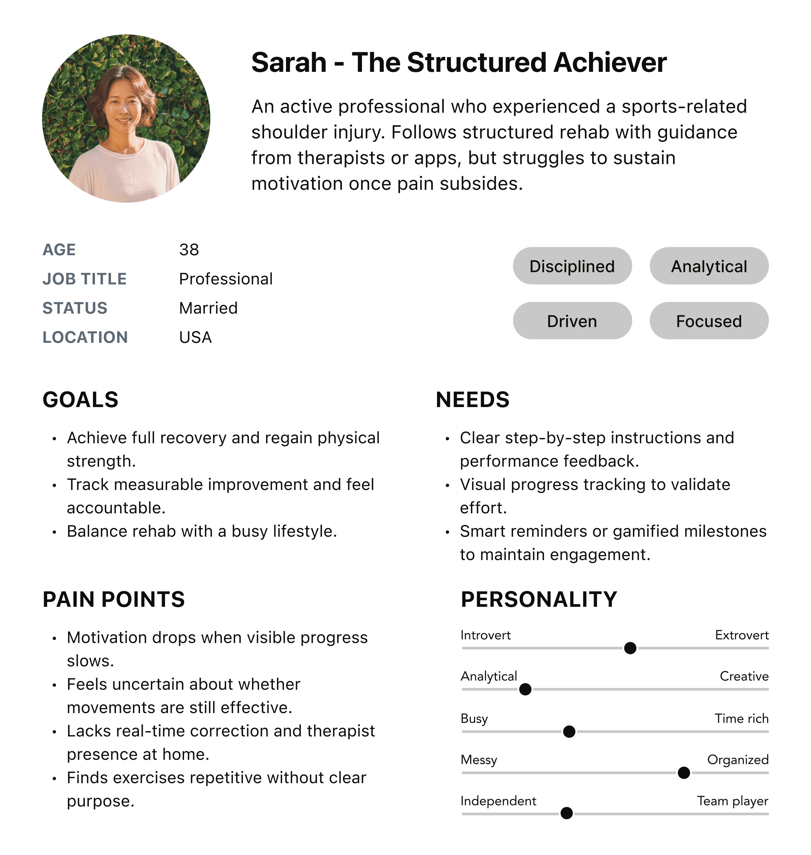 Our team chose to move forward with Sarah as our user persona. We turned abstract challenges like low motivation into concrete design requirements, guiding consistent, user-centered decisions across gameplay, feedback, onboarding, and clinician integration.