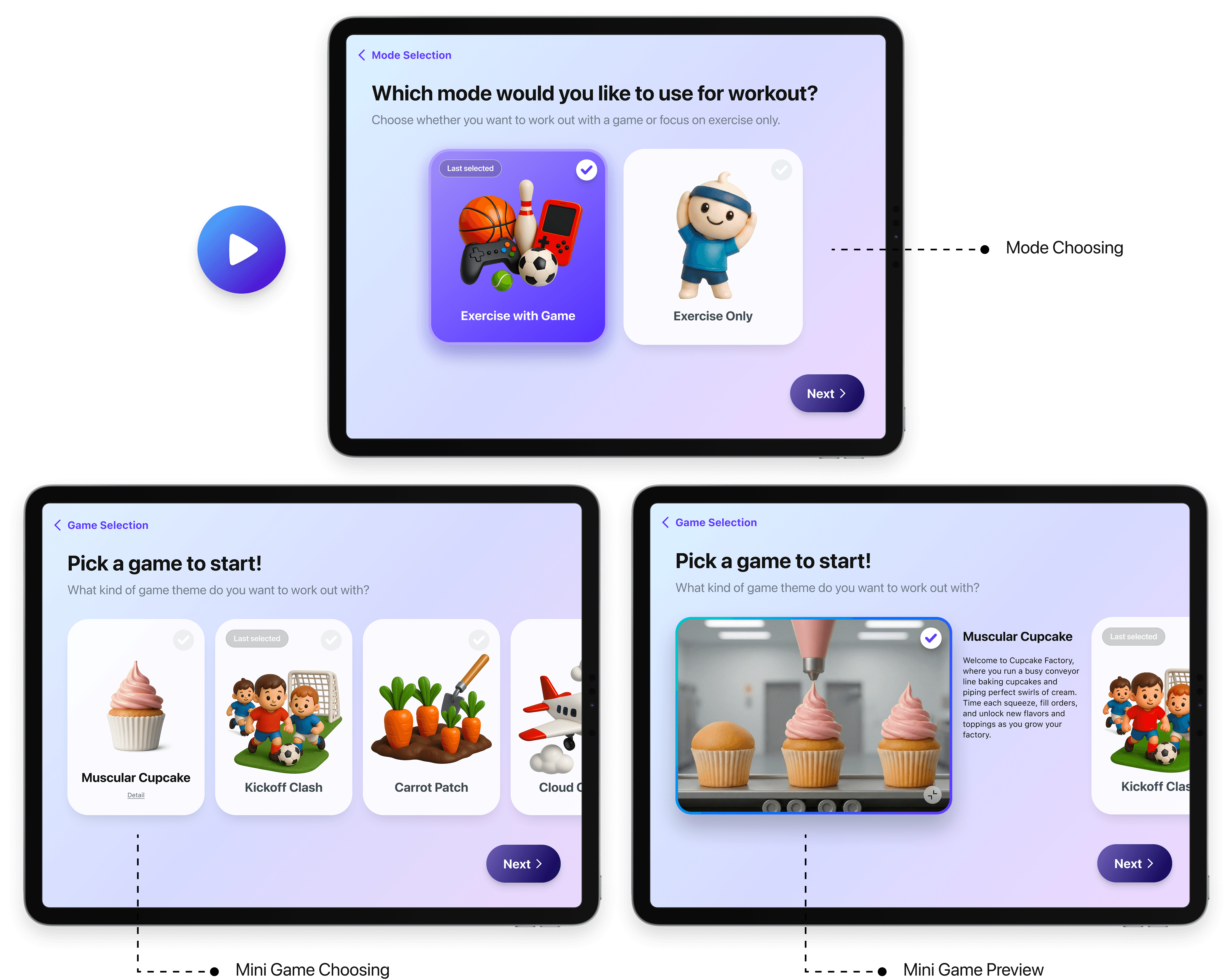 This step gives users control over how they engage with training, supporting both focus-driven and play-driven rehabilitation without adding friction.