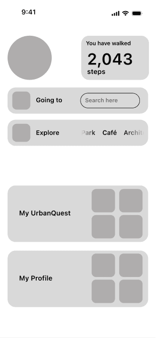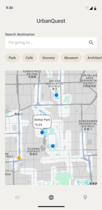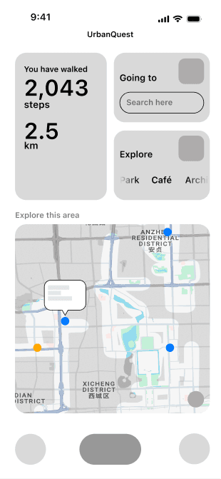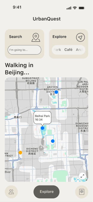 Here, users can visually explore unlocked city streets on the map or choose to explore nearby destinations. The goal is to encourage active urban exploration and help users discover hidden gems within the city.