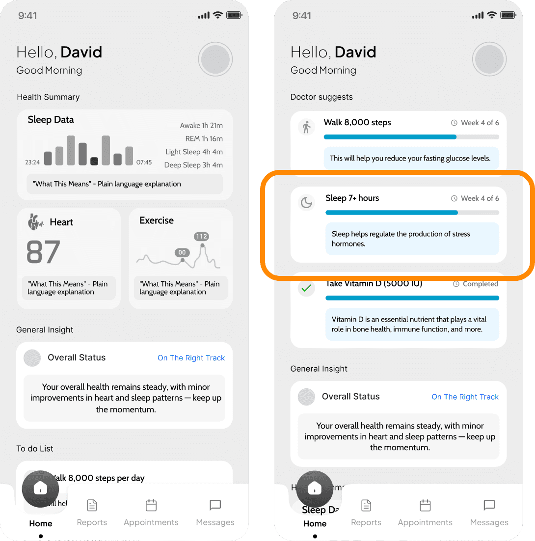 Actionable plans are suggested by AI but reviewed and approved by physicians. On the patient side, we designed lightweight streak and progress mechanisms to support consistency.Raw data is never the starting point of the experience. We organized the system around trends, baselines, and deviations, so users can answer a higher level question: Is my health moving in a good direction?