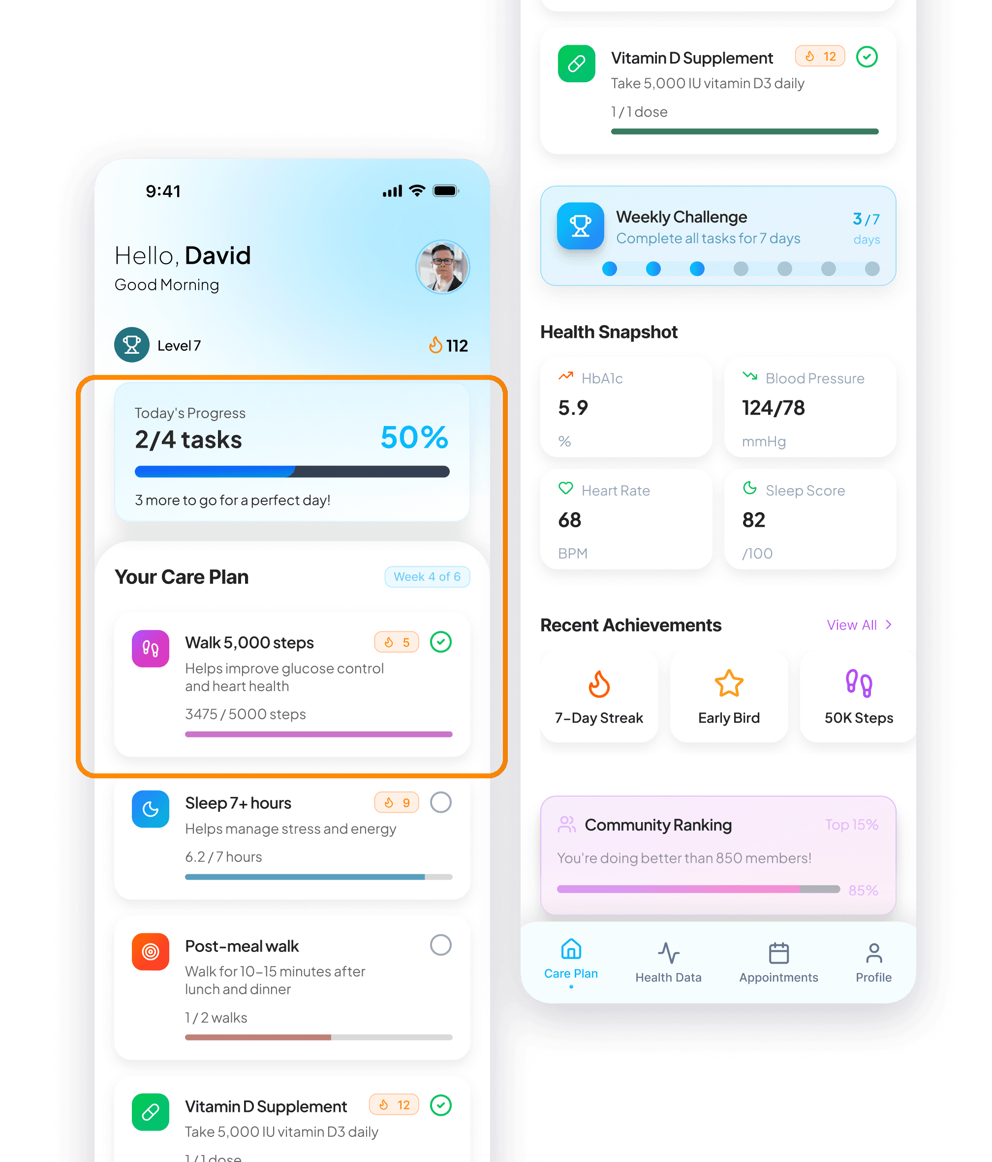 Actionable plans are suggested by AI but reviewed and approved by physicians. On the patient side, we designed lightweight streak and progress mechanisms to support consistency.