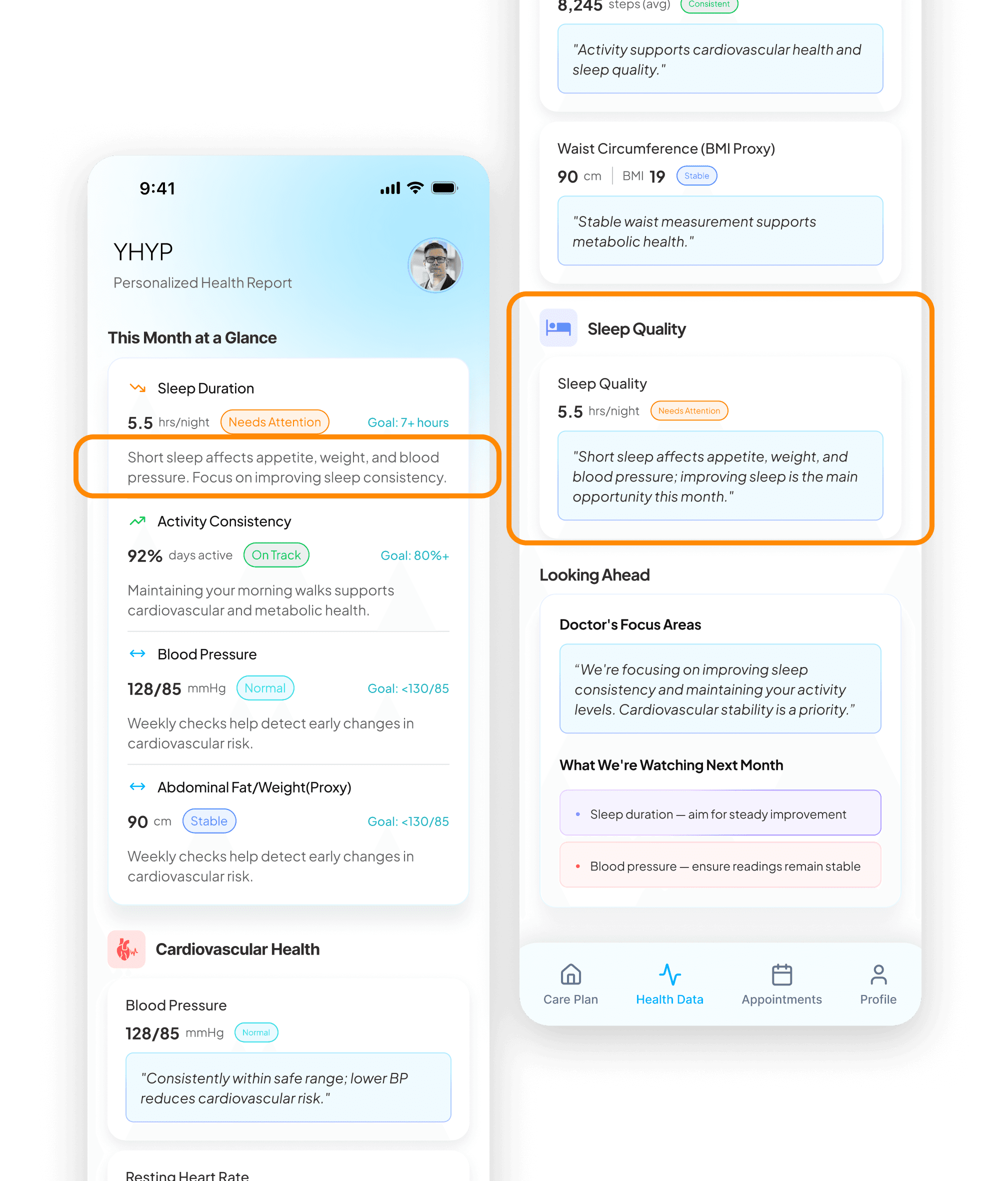 YHYP consolidates health data from multiple sources and applies AI analysis to interpret it as a whole. Instead of showing everything at once, this summary view highlights the most important health signals, helping users quickly understand what matters before diving deeper.